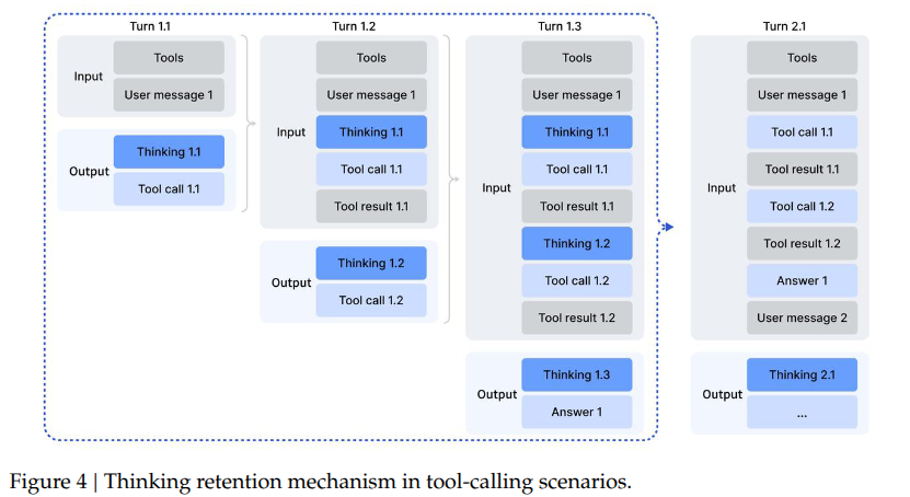 之前的 DeepSeek-R1 策略——在第二轮消息到达时丢弃推理痕迹——会导致显著的令牌效率低下。这种方法迫使模型在每次后续工具调用时,都对整个问题进行冗余的重新推理。为了缓解这一问题,团队开发了专门针对工具调用场景定制的上下文管理机制。只在开启全新任务时移除之前的推理过程,当推理痕迹被移除时,工具调用的历史及其结果依然保留在上下文中。